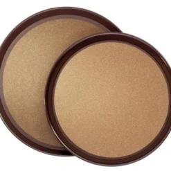 3x Contacto Antirutsch-Tablett. rund aus braunem ABS-Kunststoff. hitzeresistent bis +80C. spülmaschinengeeignet. sehr robuste. langlebige Spezialbeschichtung mit Korkanteil. temperaturbeständig bis ca. +150C. alkohol- und fettresistent. antibakteriell Durchmesser: 32 cm. Höhe: 2 cm