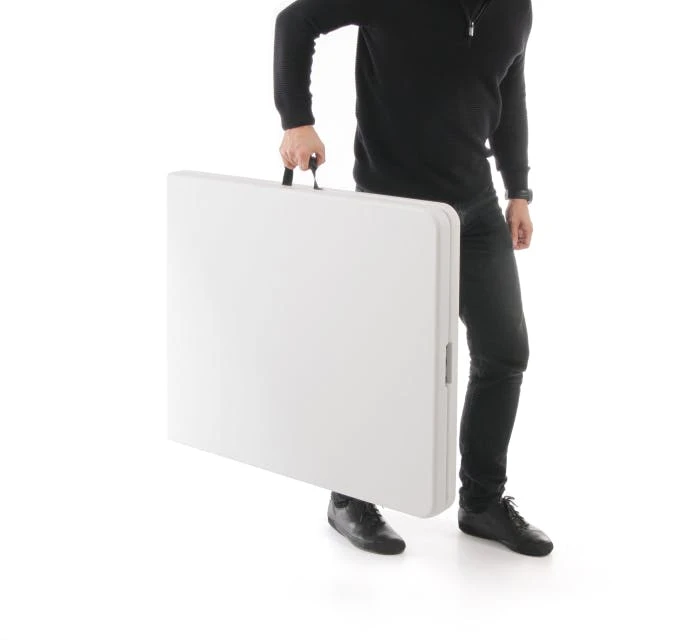 Einklappbares Untergestell und faltbare Tischplatte für praktischen Transport und platzsparende Aufbewahrung.