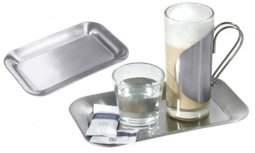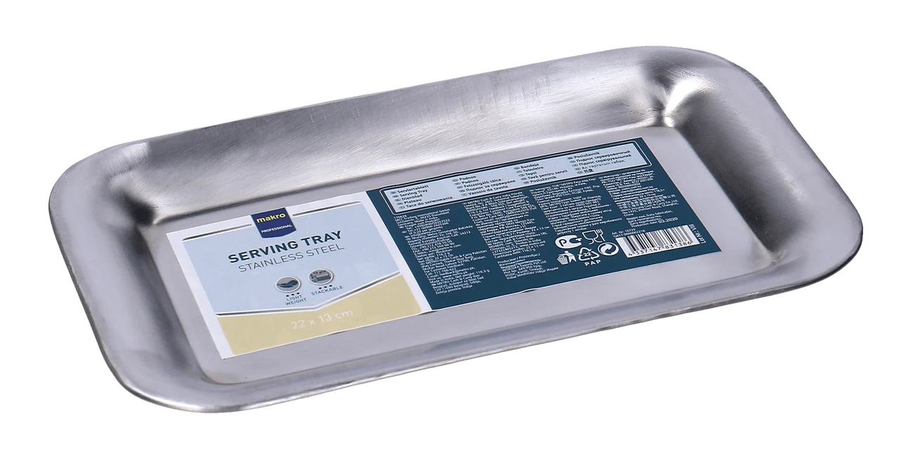 Dieses METRO Professional Tablett aus satiniertem Stahl (18/0) hat abgerundete Ecken und die Maße 21 x 13 x 1,8 cm (B x T x H). Stapelbar und spülmaschinenfest.